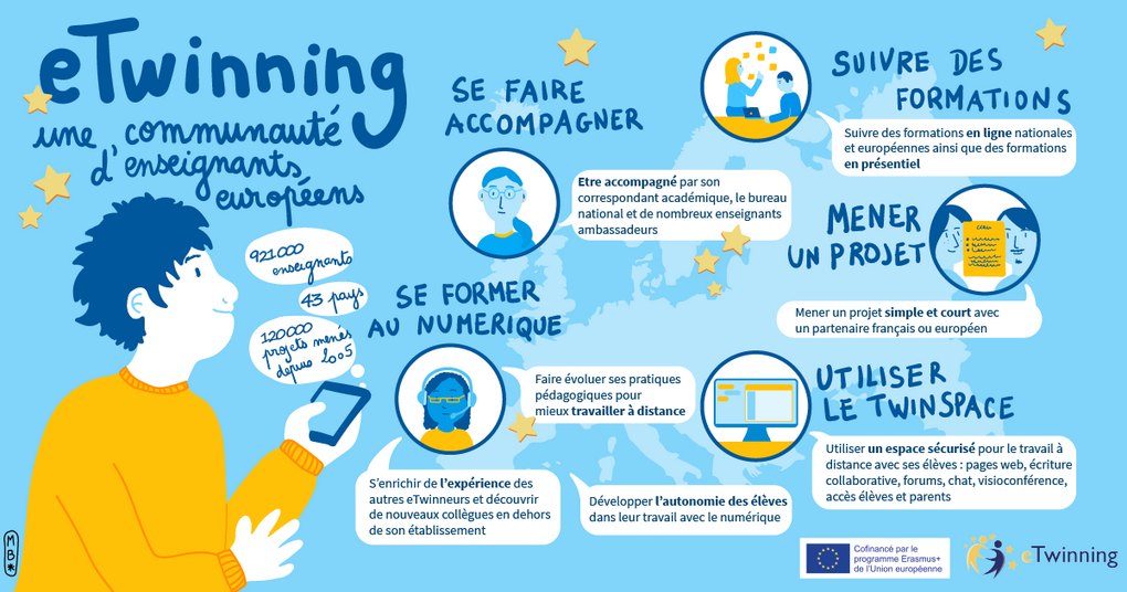 eTwinning permet de mener un projet à distance avec vos élèves, pour travailler de manière interdisciplinaire et transversale, pour dynamiser votre enseignement et impliquer davantage vos élèves, et pour votre développement professionnel.