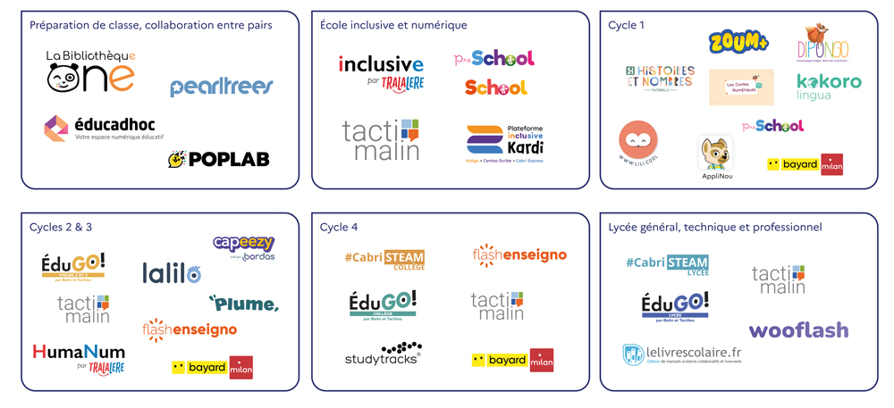 Depuis janvier 2023, des solutions numériques éducatives viennent compléter cette offre. À ce jour, les enseignants peuvent se former et installer douze solutions : Lalilo/Plume, PopLab, Preschool/School, CabriSTEAM collège et lycée, Pearltrees, Wooflash, Capeezy et Flash Enseigno Cycles 2 et 3 et Cycle 4.