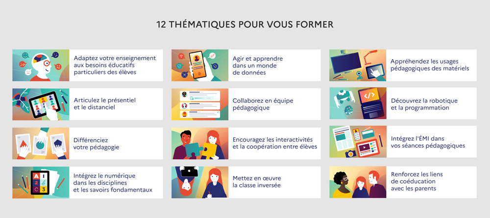 - Enseigner avec le numérique (avec par exemple la thématique : « Intégrez le numérique dans les disciplines et les savoirs fondamentaux ») ;
