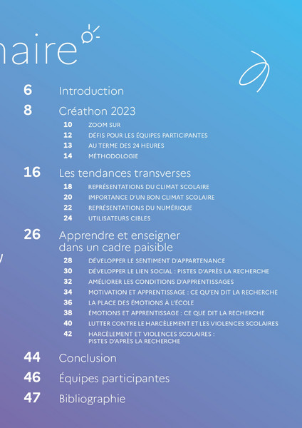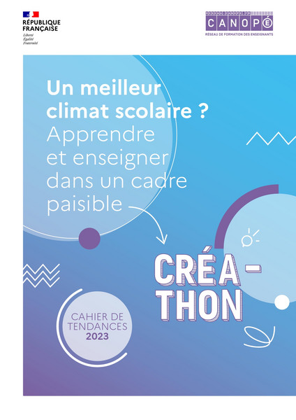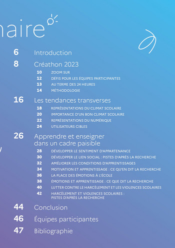Le cahier de tendances met à l’honneur l’ensemble des projets transmis au terme des 24 heures du Créathon 2023. Il présente les idées, les problématiques, les représentations des participants autour de la thématique de cet hackathon pédagogique "Un meilleur climat scolaire ? Apprendre et enseigner dans un cadre paisible". Pour répondre à cette thématique, les équipes de participants proposent des projets favorisant les relations entre les acteurs de l'éducation afin de développer un sentiment d'appartenance, que ce soit en classe ou à l'ensemble de l'établissement. Elles mettent en avant l'importance de la qualité de la formation et proposent également de rendre l'environnement scolaire plus sécurisant.