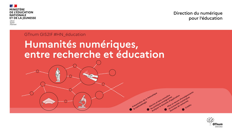 Les GTnum sont des groupes thématiques numériques coordonnés et soutenus par la Direction du Numérique pour l'Education. Leurs productions sont accessibles sur éduscol et sur le carnet Hypothèses "Education, numérique et recherche".