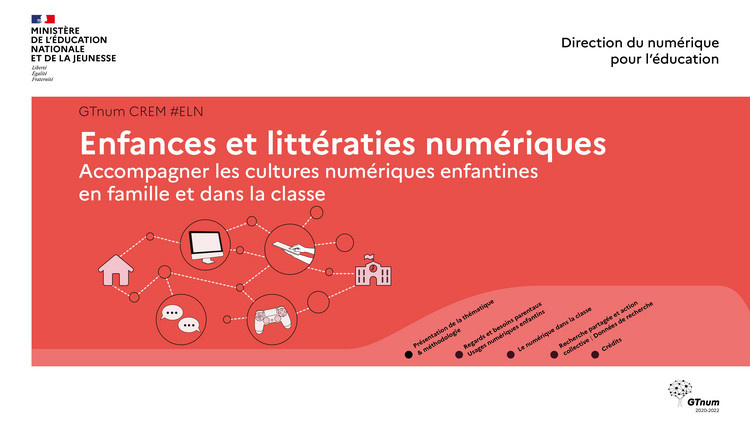 À travers un regard pluridisciplinaire, l’objectif du GTnum CREM #ELN (Enfances et littératies numériques) a été d’apporter des propositions concrètes pour une meilleure considération des disparités sociales et territoriales, et plus largement des pratiques numériques enfantines et des besoins exprimés par les parents quant à l’accompagnement de ces pratiques et au développement de compétences numériques.