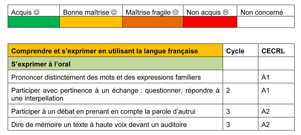 Exemple 4 : grille de compétences réalisée dans le cadre de l’évaluation d’une récitation en français, suivie d’un débat collectif autour du texte déclamé