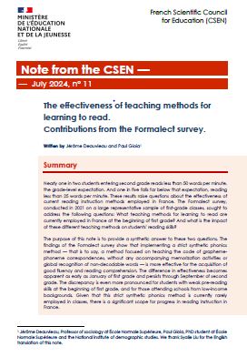 The Formalect survey, conducted in 2021 on a large representative sample of first-grade classes, sought to address the following questions: What teaching methods for learning to read are currently employed in France at the beginning of first grade? And what is the impact of these different teaching methods on students' reading skills? The purpose of this note is to provide a synthetic answer to these two questions.