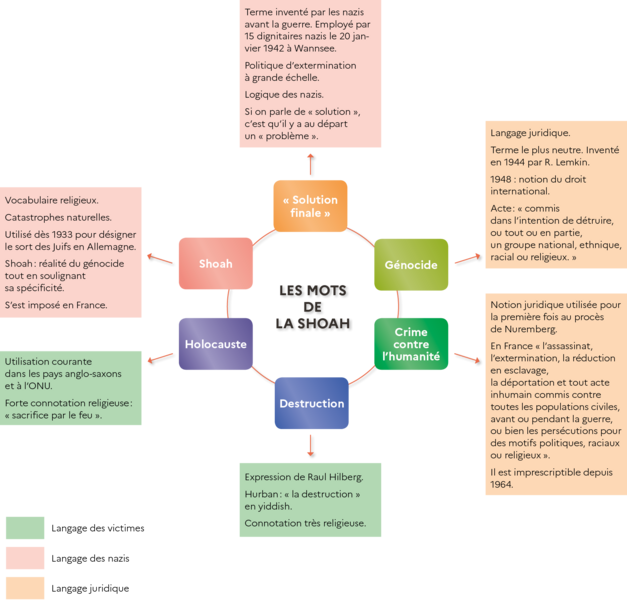 Le vocabulaire pour nommer la politique accomplie par les nazis durant la Seconde Guerre mondiale est donc varié mais d’une grande complexité. Les mots et les expressions utilisées peuvent être classés en trois catégories : le langage nazi, le langage des victimes et le langage juridique. Les programmes scolaires, et les manuels, traduisent cette complexité. Ils privilégient désormais les termes les plus neutres, empruntés au langage juridique et technique, en particulier celui de génocide, par exemple « génocide des Juifs et des Tziganes » en classe de 3e et en classe de terminale (séries technologiques). Le mot « Shoah » a fait son apparition dans les programmes de terminale (série générale), c’est un concept désormais clairement historicisé et utilisé par les historiens.