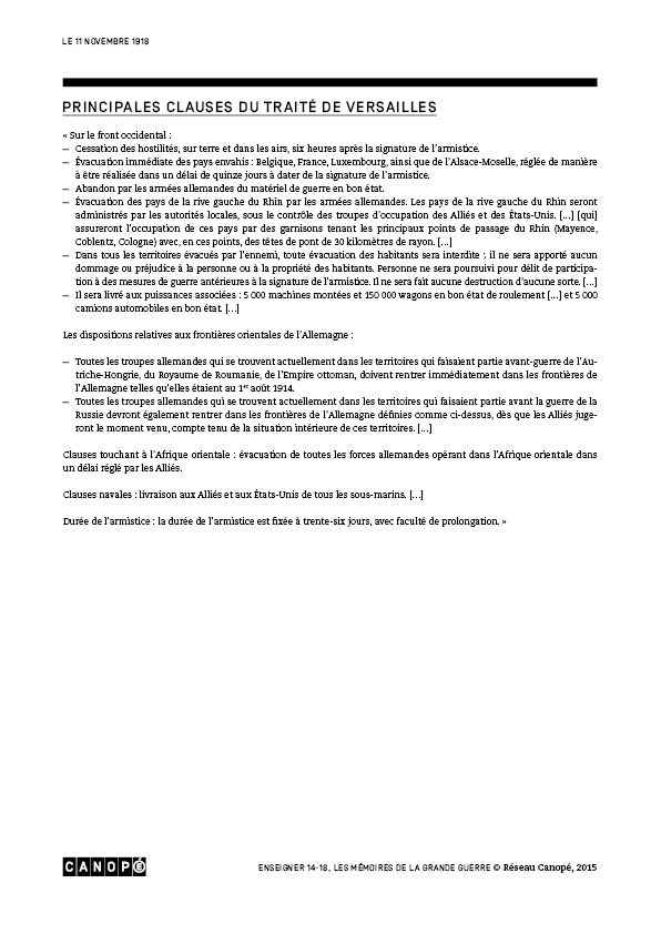 Les principales clauses du traité de VersaillesDer Versailler Vertrag aus der deutscher Sicht14 points de base du traité de VersaillesL’Armistice vu par M. GenevoixBilan humain de la guerreFiche de prép Le 11 novembre 1918Les Big FourLe Diktat