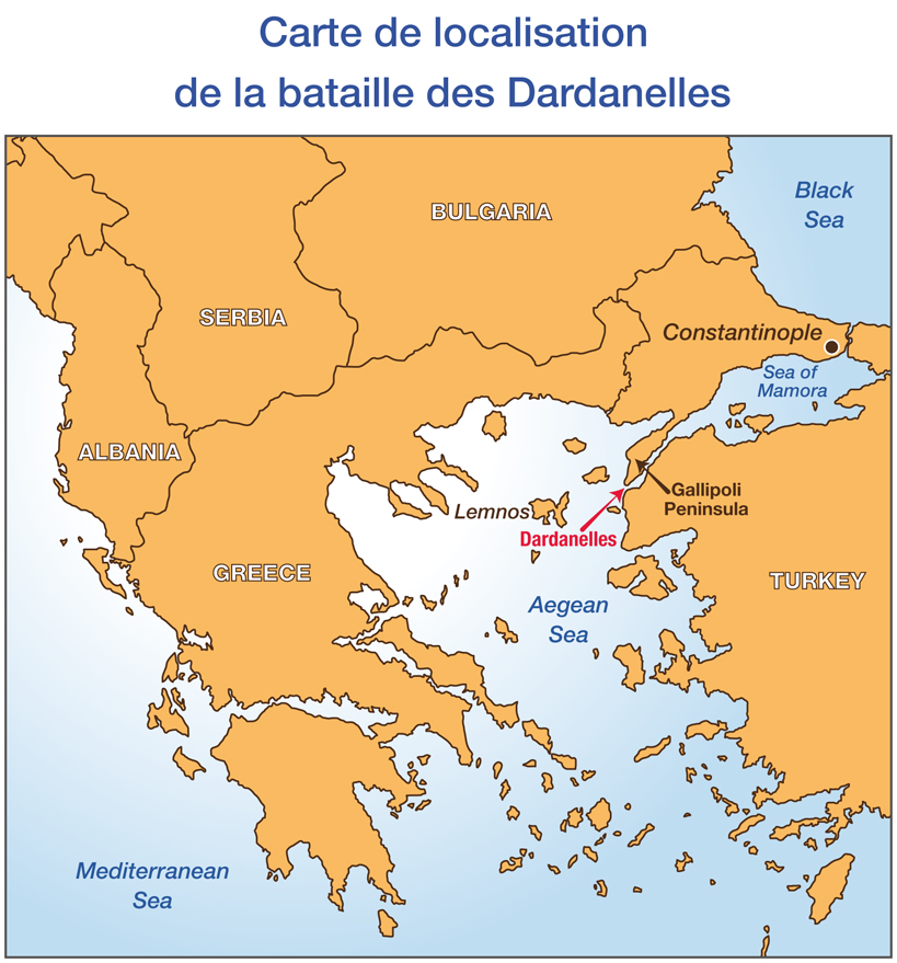 Soldats australiensSoldats turcsCarte de localisation de la bataille des Dardanelles