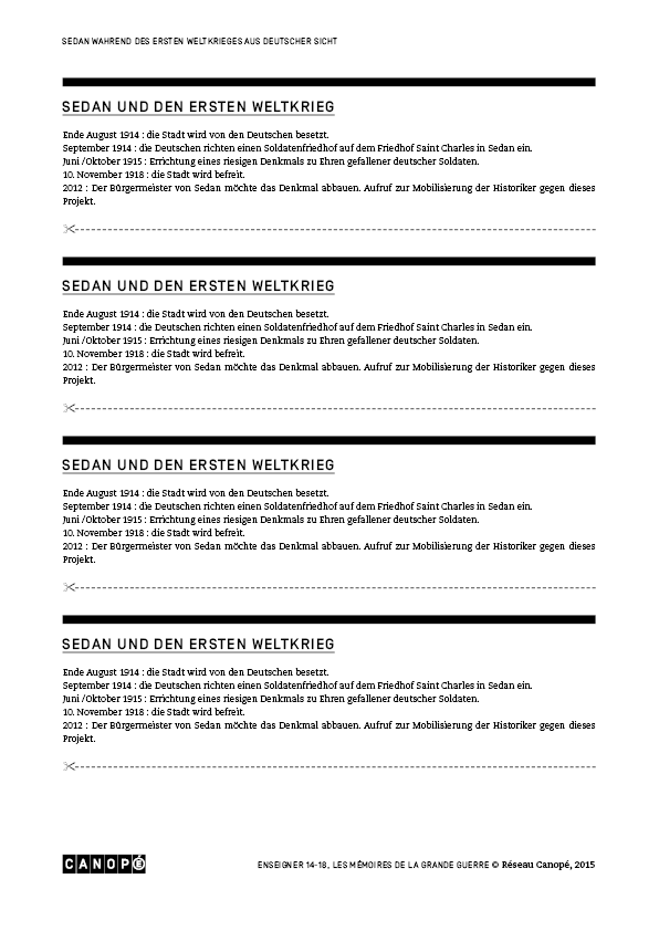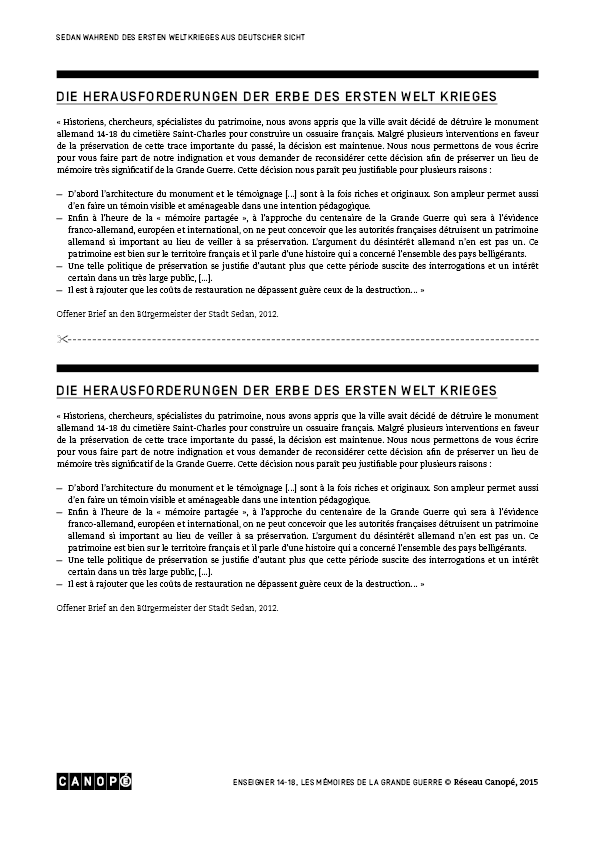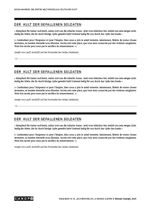 Journal de guerre d’un enfant de SedanSedan und den Ersten WeltkriegDer Kult der gefallenen SoldatenSedan, eine besetzte und unterdrückte StadtDie Herausforderungen des Erbes des Ersten WeltkriegesSedantagLe monument aujourd’hui (1)Le monument aujourd’hui (2)Le monument à la fin de la guerre