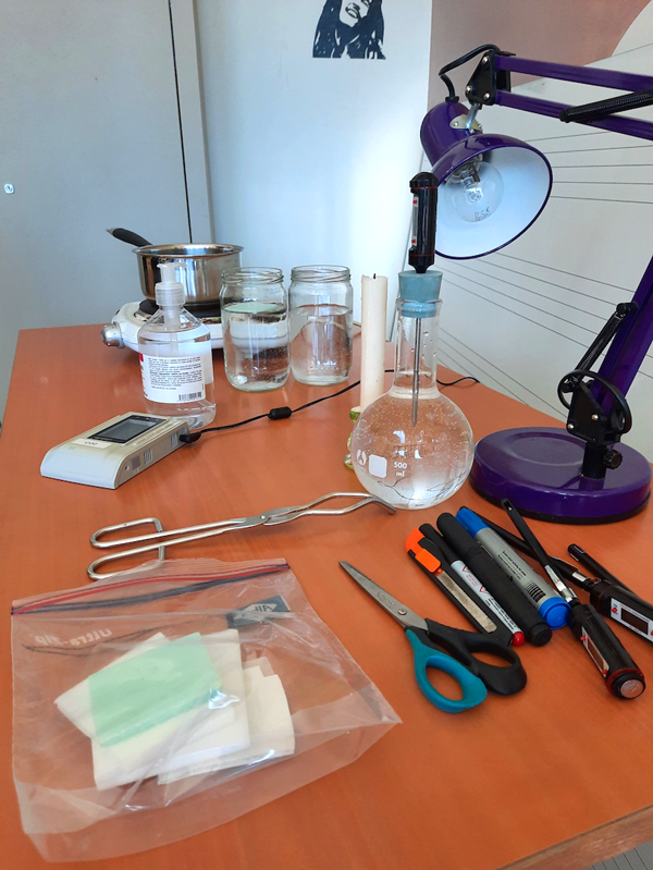 Des expériences scientifiques sont menées pour illustrer et reproduire des phénomènes climatiques, comme par exemple la combustion de produits issus du pétrole.