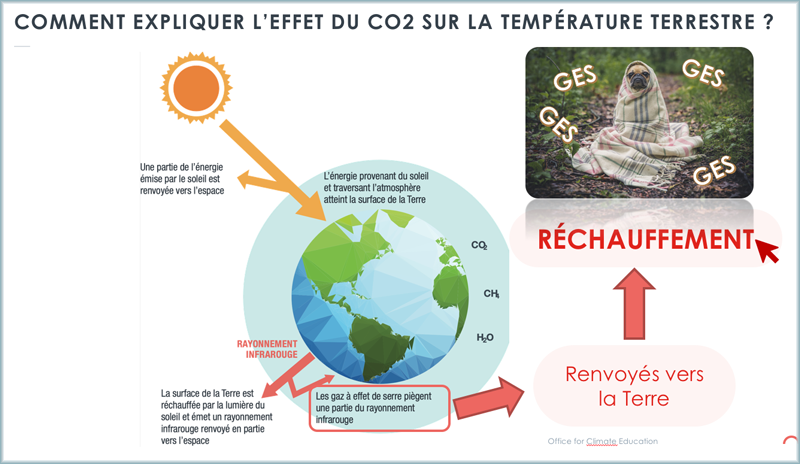 de l’Office for Climate Education (OCE), présente aux élèves un exposé très pédagogique sur le réchauffement climatique ainsi que ses impacts sur les terres émergées (forêts, surfaces agricoles, zones de montagne) et l’agriculture.