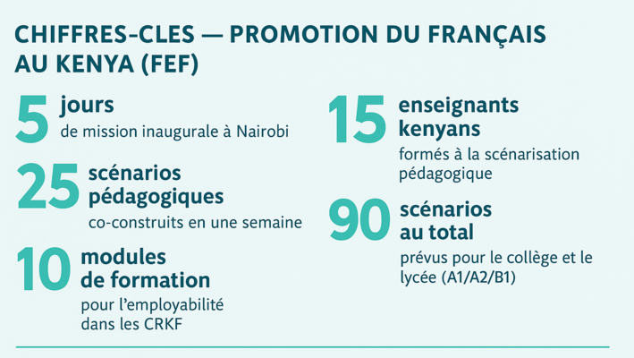 Fort des résultats de DEFIK, l’Ambassade de France au Kenya a engagé un nouveau Fonds Equipe France (FEF) 2025-2027, intitulé « Promotion du français au Kenya (milieu professionnel) ». Celui-ci vise à renforcer la qualité, l’inclusivité et l’attractivité de l’enseignement du français dans les établissements scolaires et universitaires, tout en soutenant l’employabilité des apprenants.