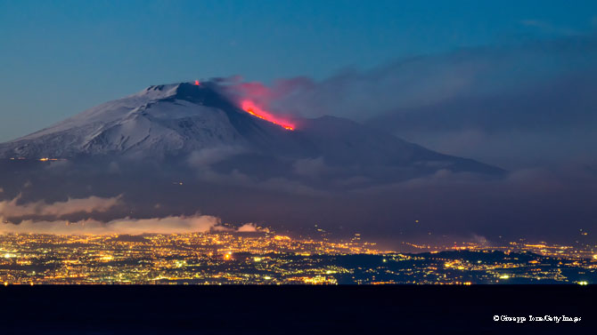 La ville de Catane en Sicile avec en arrière-plan l’Etna au cours de l’une de ses éruptions. – © Giuseppe Torre/Getty Images