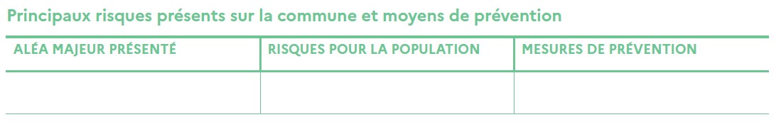 | SUJET DE LA RECHERCHE | Quel est l’aléa majeur de ma commune ? | Quels sont les risques possibles pour la population ? | Quels sont les moyens de prévention/protection/adaptation/atténuation ? |