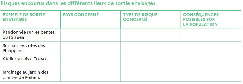 Le but est de choisir la destination selon le critère de sécurité : quel sera le séjour qui nous exposera le moins aux risques naturels ? On peut alors construire avec les élèves un tableau mettant en rapport les destinations envisagées et les risques encourus.