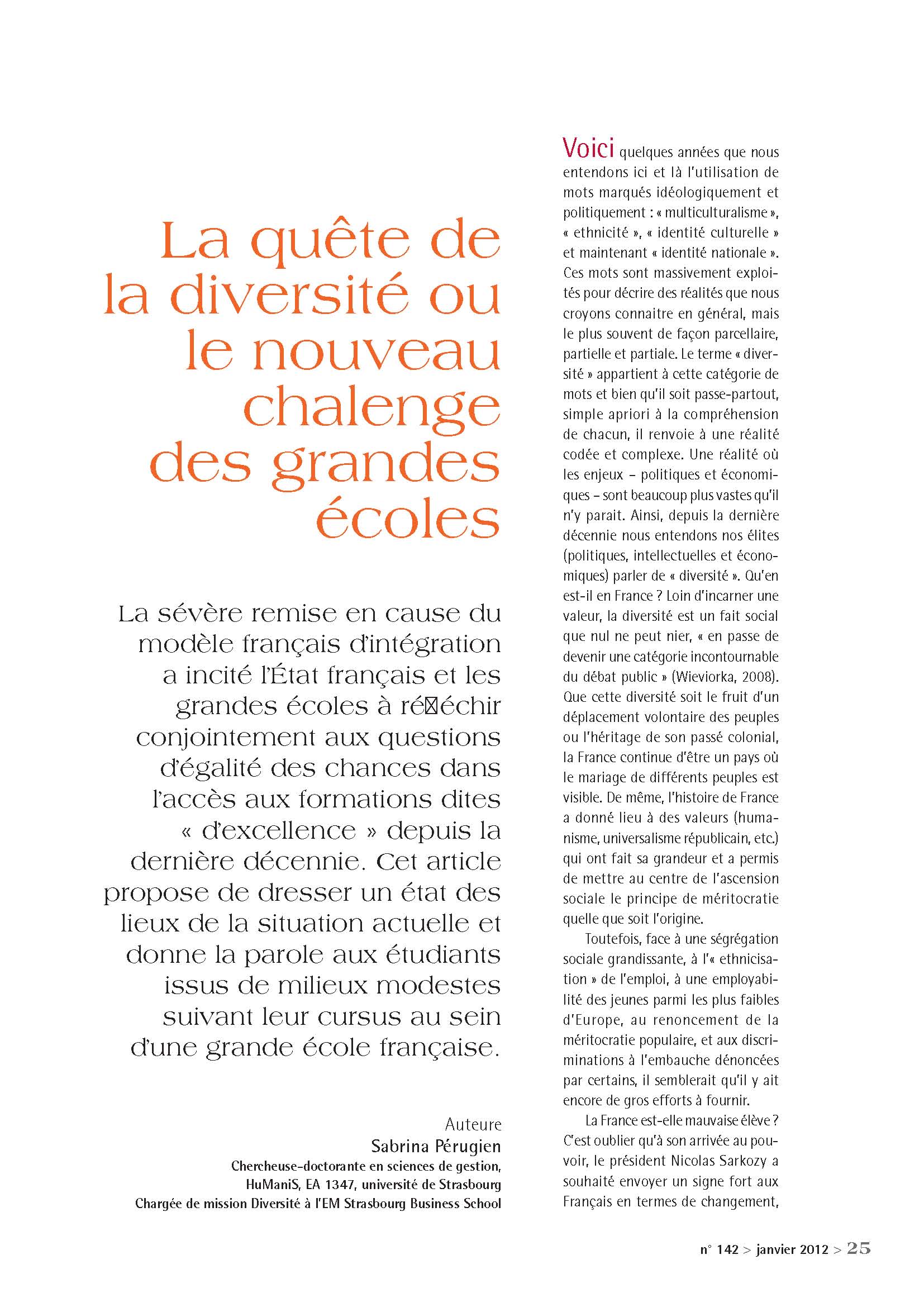 La sévère remise en cause du modèle français d’intégration a incité l’État français et les grandes écoles à réfléchir conjointement aux questions d’égalité des chances dans l’accès aux formations dites « d’excellence » depuis la dernière décennie. Cet article propose de dresser un état des lieux de la situation actuelle et donne la parole aux étudiants issus de milieux modestes suivant leur cursus au sein d’une grande école française.