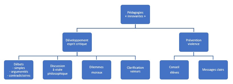 - d’un point de vue « éthico-pratique », les pédagogies innovantes, qui illustraient en grande partie la teneur « morale » de cet enseignement, ont toutes été évincées. En 2018, n’apparaissent que les débats argumentés et la discussion réglée ;