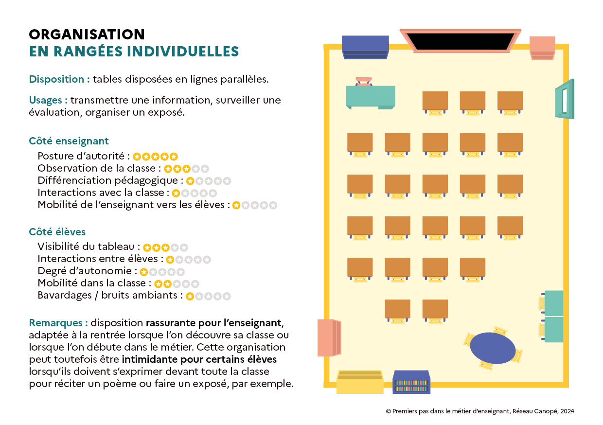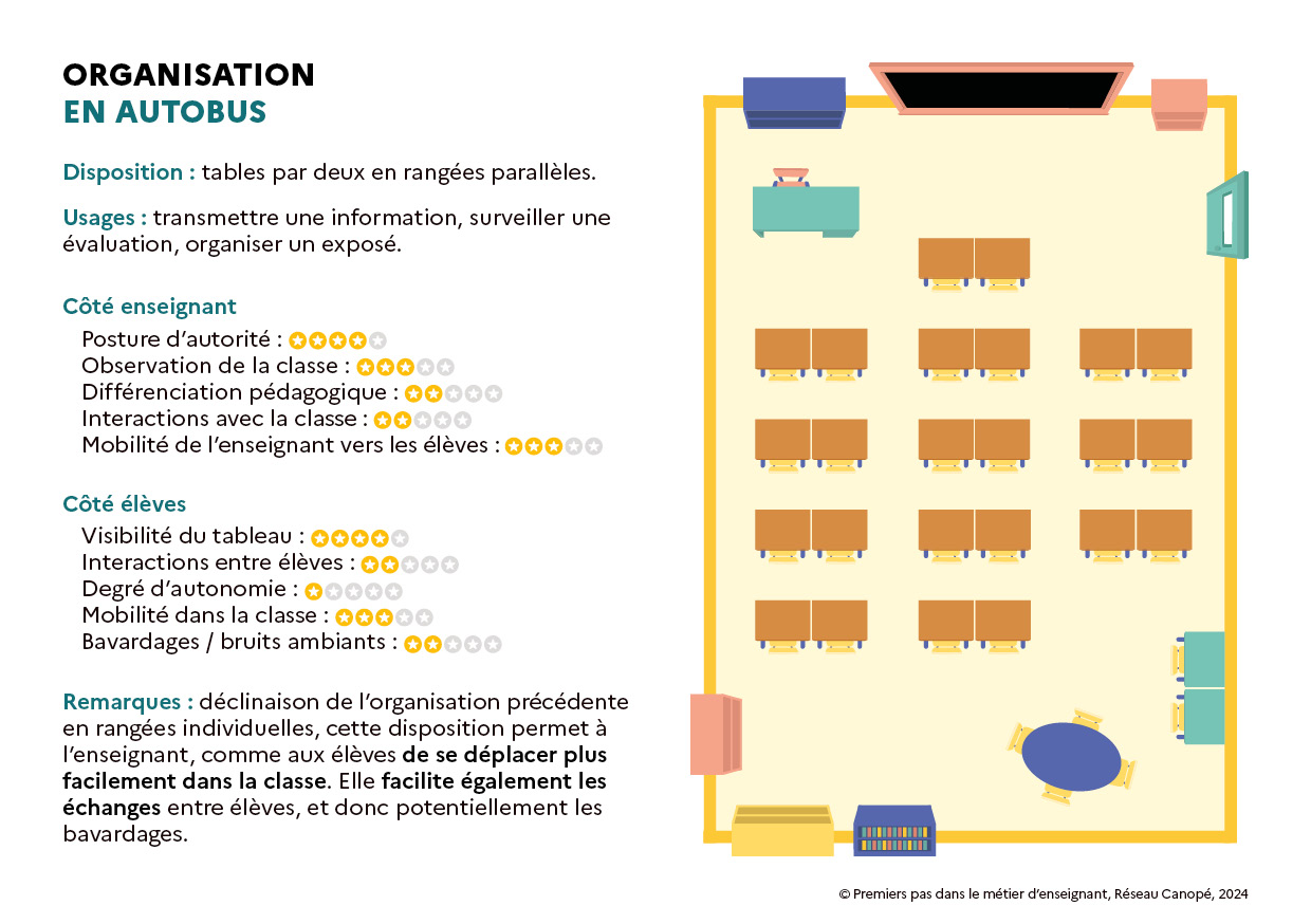 ► En début d’année, n’hésitez pas à choisir un environnement plutôt sécurisant pour vous (disposition en rang d’oignons ou en autobus par exemple), le temps que certains automatismes de classe se mettent en place et que vous ayez une meilleure connaissance individuelle de vos élèves.