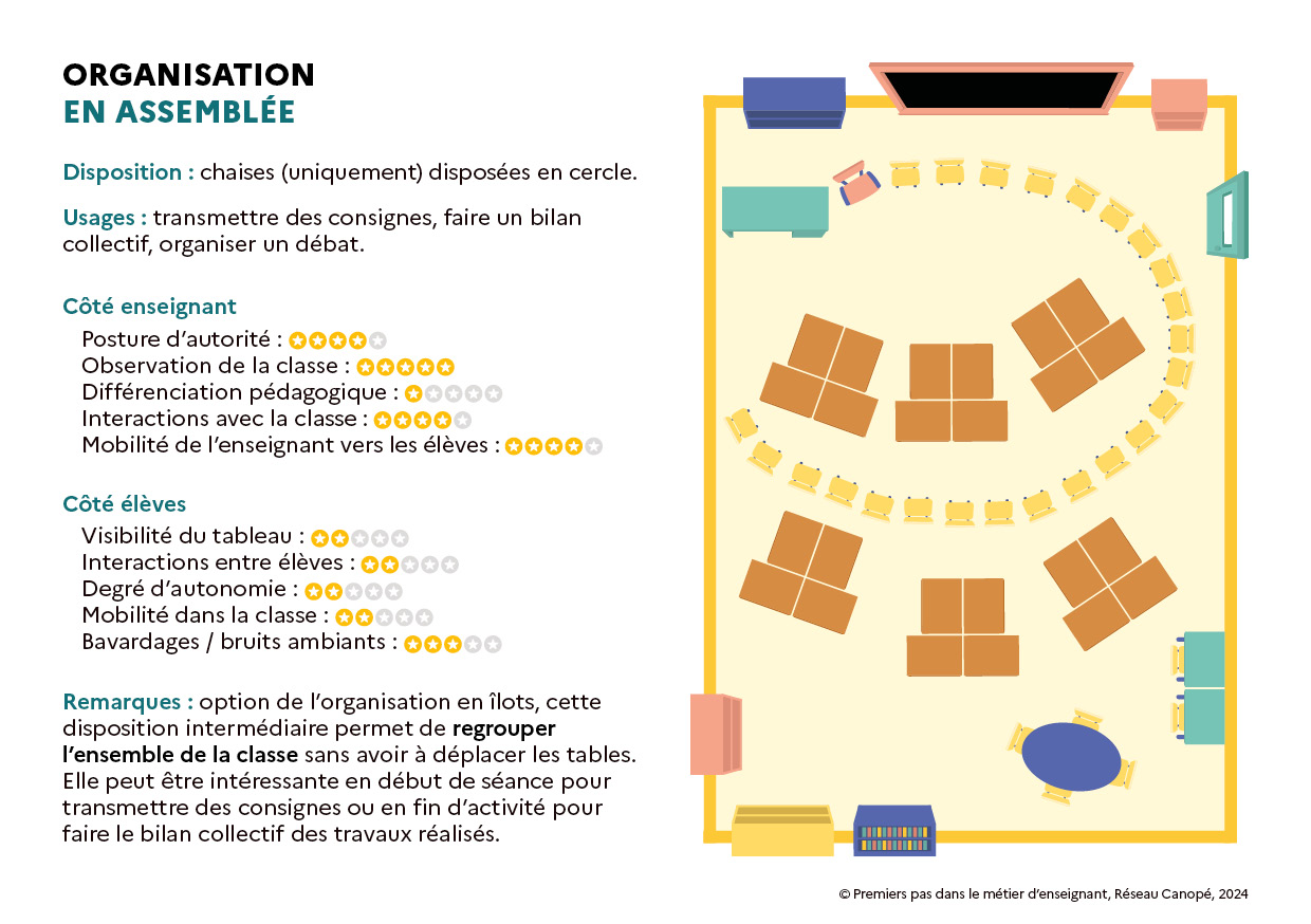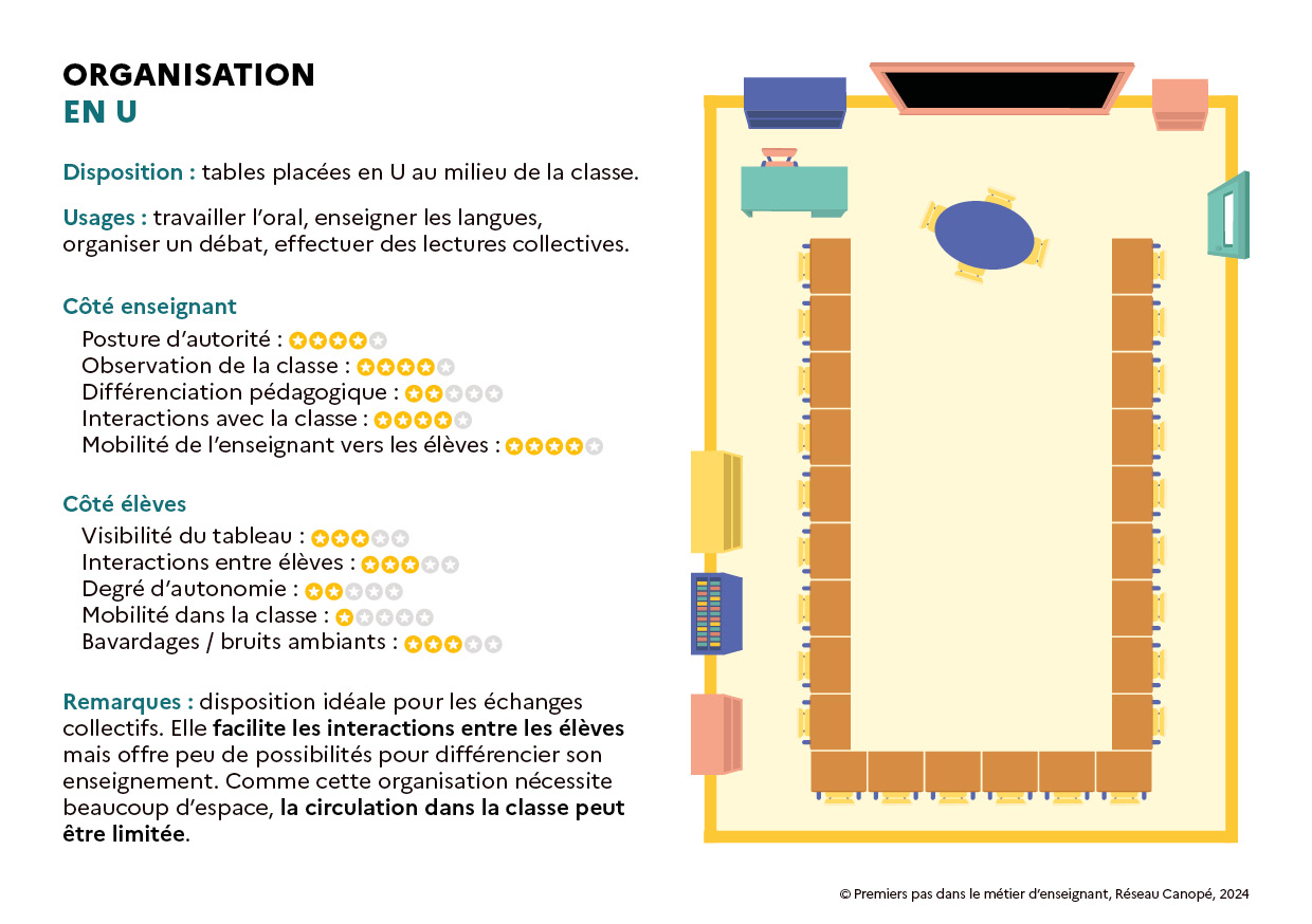 - La manière dont vous organisez votre classe n’est pas neutre : elle reflète vos intentions pédagogiques à un moment donné de l’année. Souhaitez-vous privilégier le travail collectif ou en petits groupes ? Limiter les bavardages ou encourager les échanges ? Favoriser le travail individuel ou l’esprit d’entraide et de coopération ? Suivant vos préférences et objectifs, telle disposition de classe sera plus adaptée qu’une autre.
