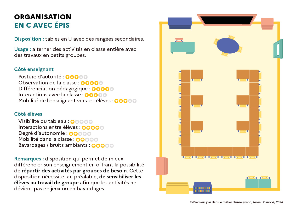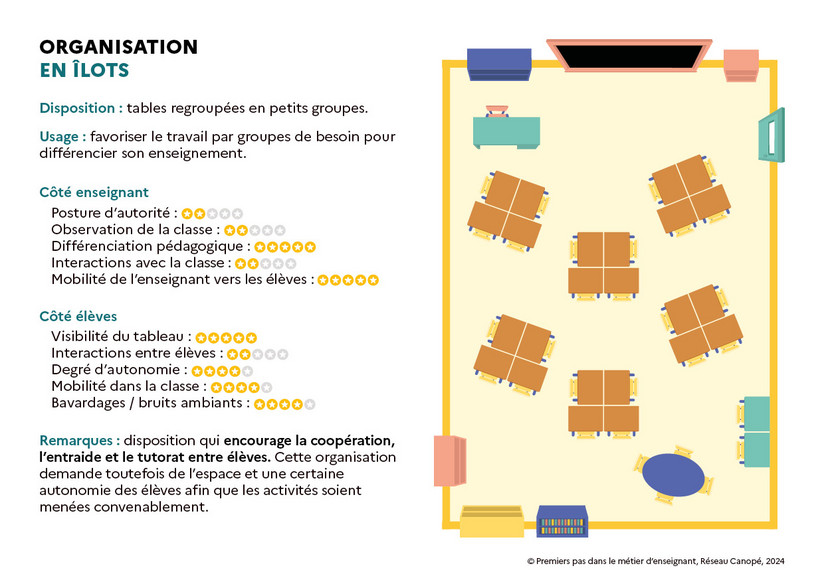 ► Une fois certaines « routines » de classe établies, tentez d’autres agencements qui vous permettront de différencier plus facilement votre enseignement (disposition en C ou en îlots).