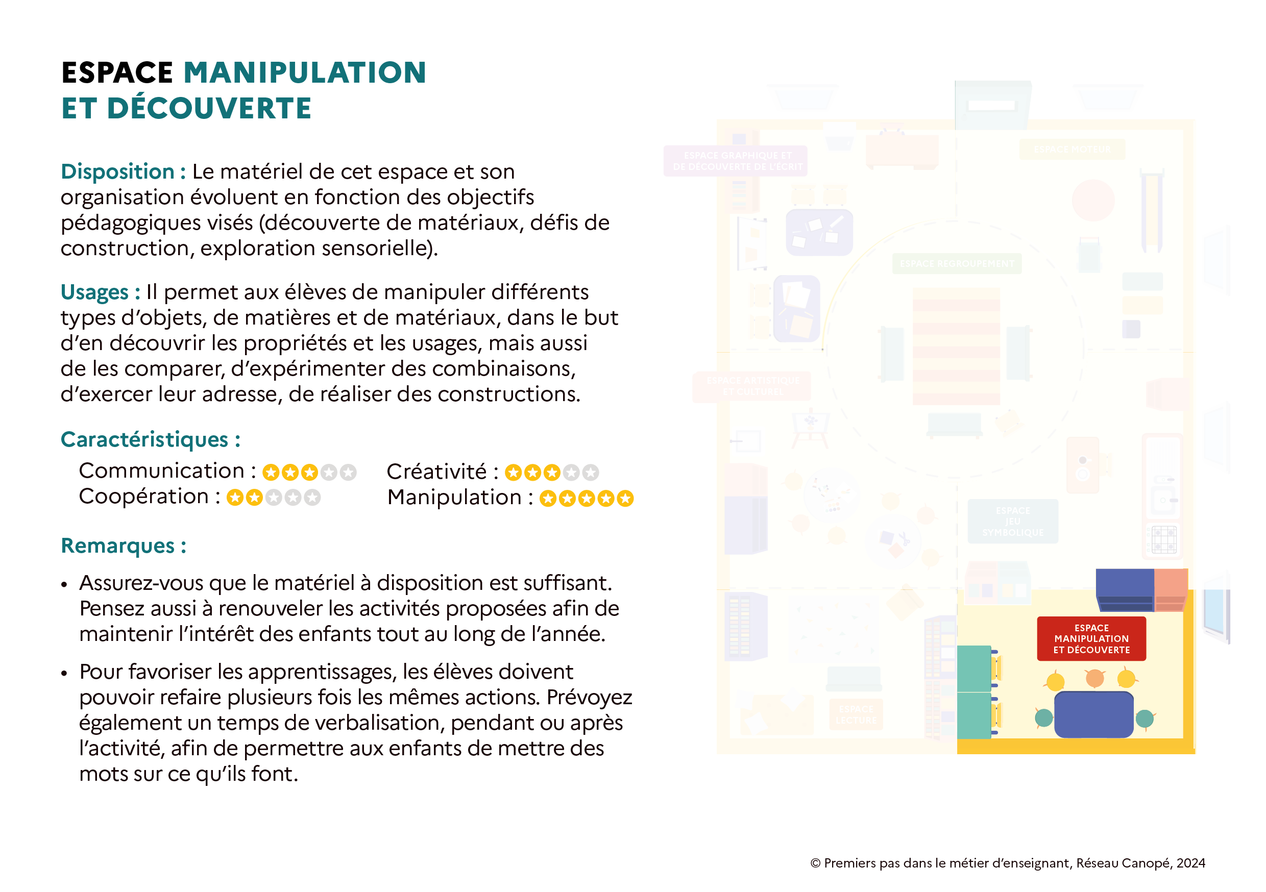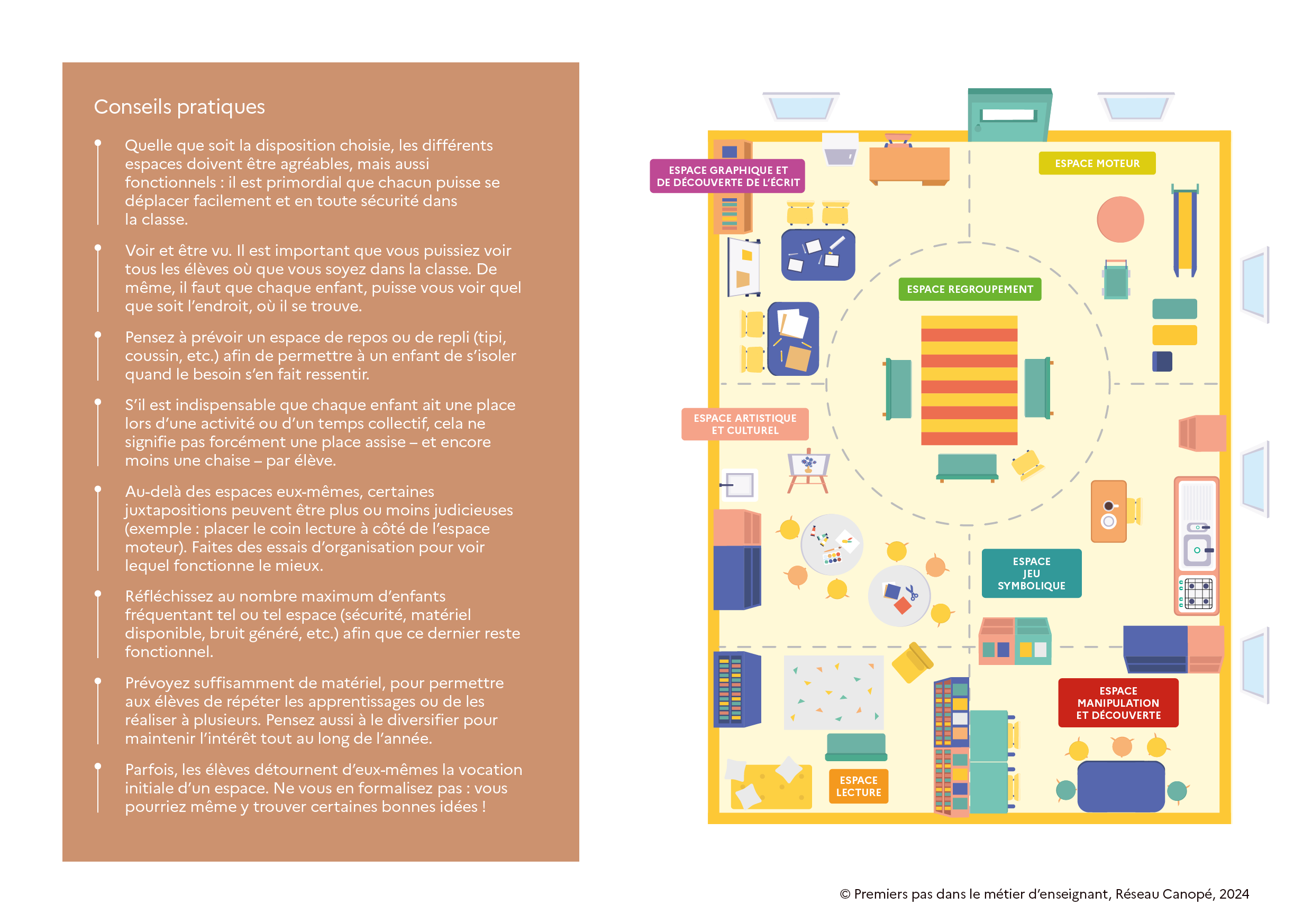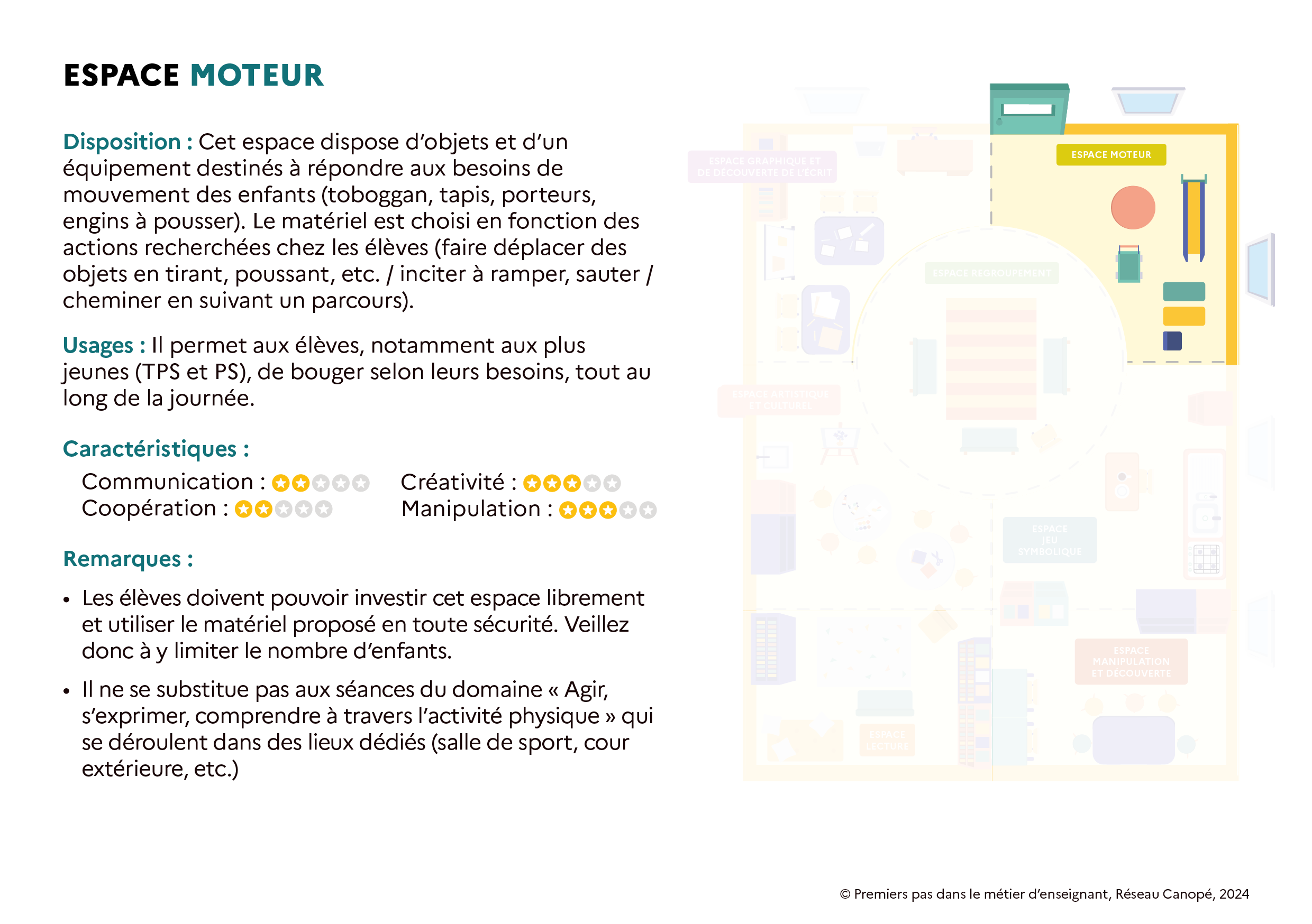 La classe présentée dans ce document est bien entendu factice. Elle juxtapose des espaces, sans prendre en compte, les contraintes de place, d’agencement, de mobilier et de matériel que vous rencontrez dans la réalité. L’objectif n’est pas de montrer une « classe idéale » mais de présenter les usages et caractéristiques de sept espaces spécifiques, courants en maternelle, afin que vous puissiez vous en emparer plus facilement.