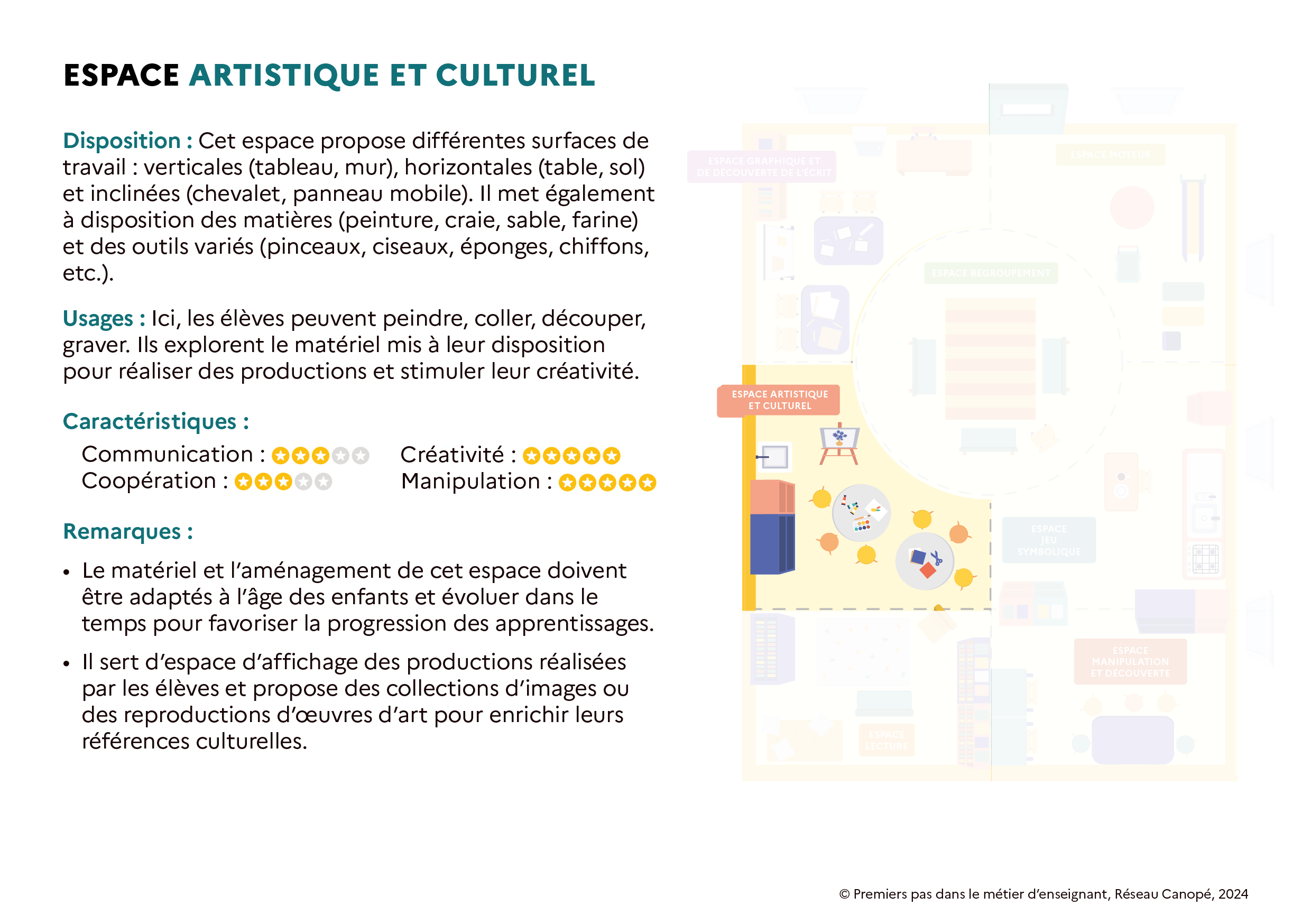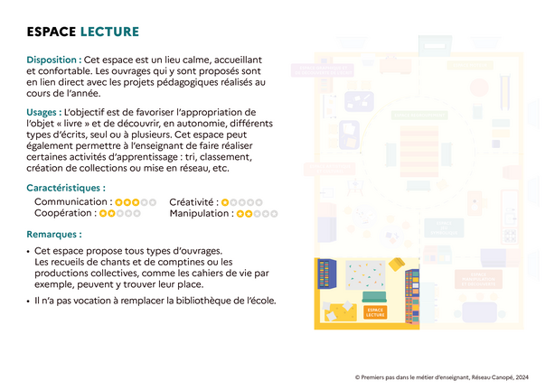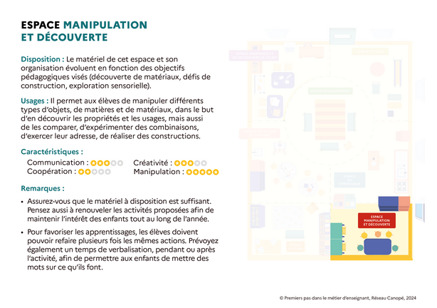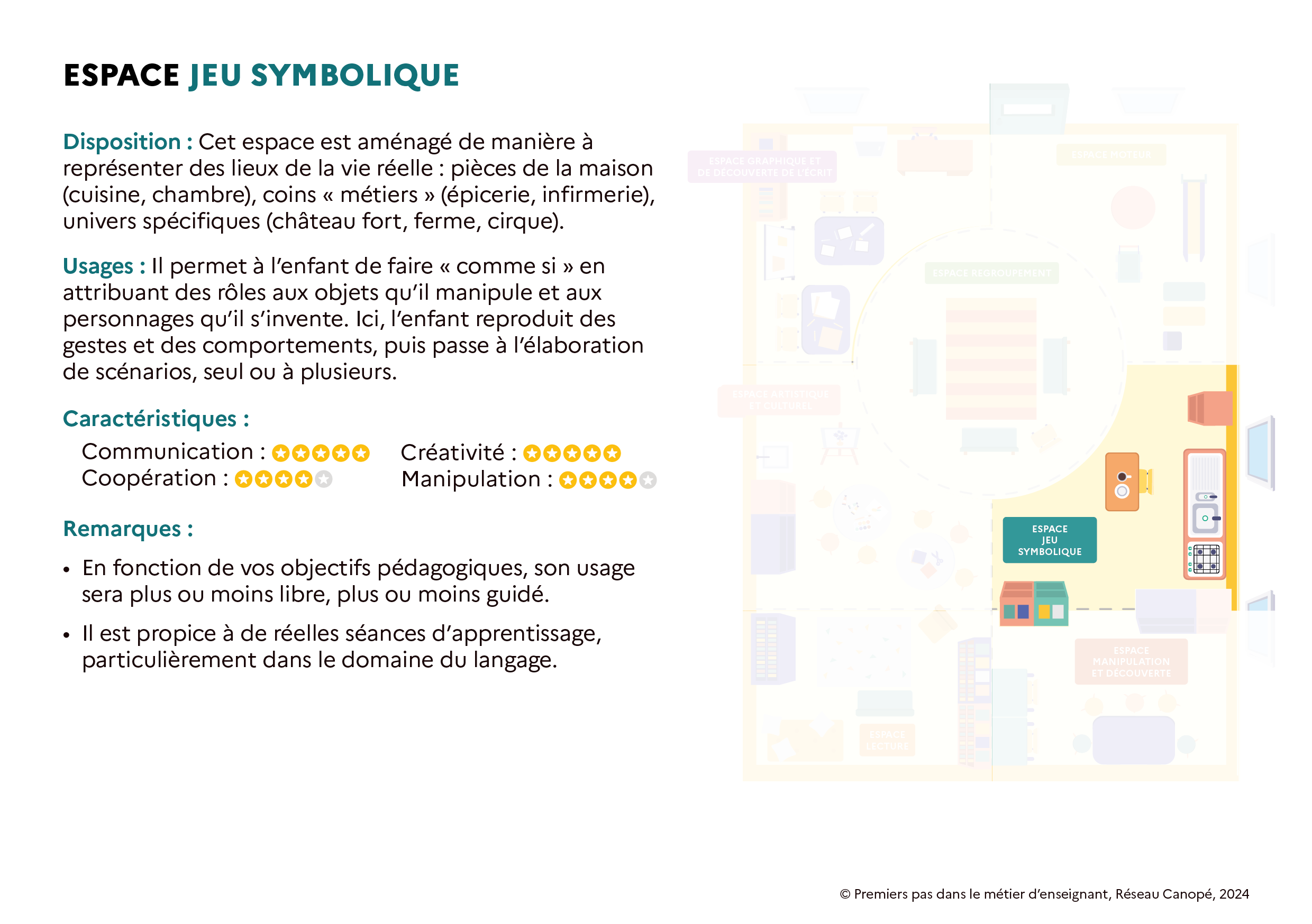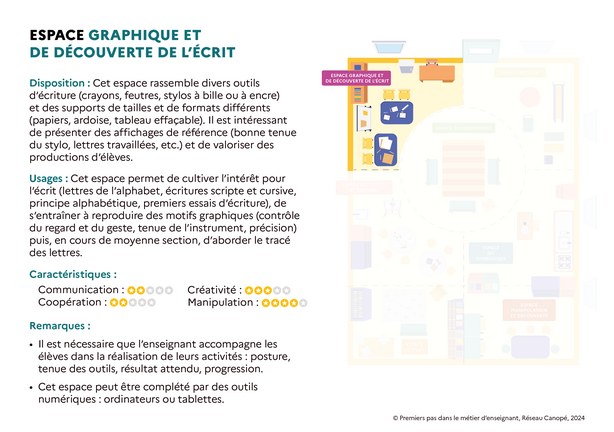 La classe présentée dans ce document est bien entendu factice. Elle juxtapose des espaces, sans prendre en compte, les contraintes de place, d’agencement, de mobilier et de matériel que vous rencontrez dans la réalité. L’objectif n’est pas de montrer une « classe idéale » mais de présenter les usages et caractéristiques de sept espaces spécifiques, courants en maternelle, afin que vous puissiez vous en emparer plus facilement.