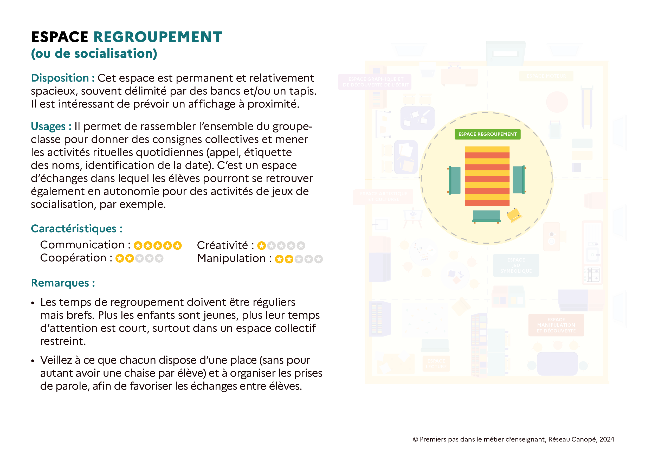 - L’usage d’un espace peut changer en fonction de vos besoins du moment. Parfois, ce sont les élèves eux-mêmes qui en détournent la vocation initiale. La table de l’espace destiné à la manipulation peut, par exemple, être utilisée temporairement par des élèves pour une activité qui nécessite d’être assis mais qui ne relève pas de ce domaine. De même, l’espace de regroupement peut servir, en dehors des temps collectifs, à rassembler un petit groupe d’élèves pour une séance de langage. Soyez flexible et pragmatique afin d’optimiser l’espace et le matériel dont vous disposez en fonction des activités envisagées.