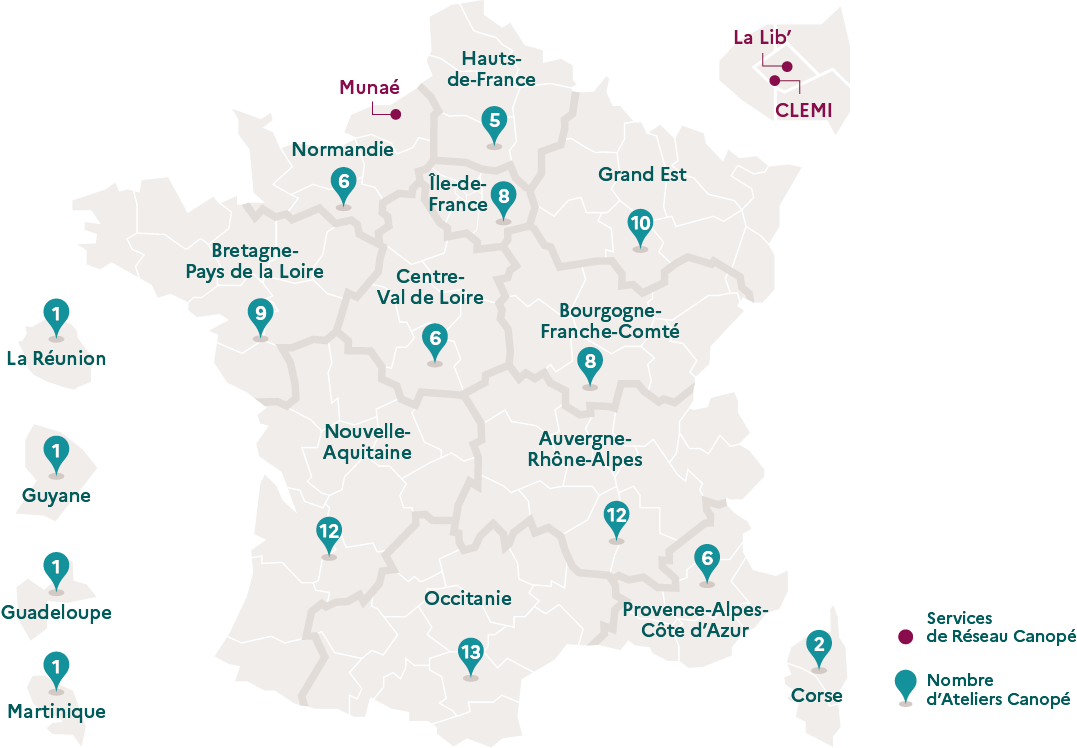 Réseau Canopé, dont le siège social est situé au cœur de « Poitiers, capitale de l’Éducation », est présent au plus près des territoires, à travers ses 11 directions territoriales, ses 5 directions académiques (Corse et Outre-mer) et ses 101 Ateliers Canopé implantés dans chaque département.