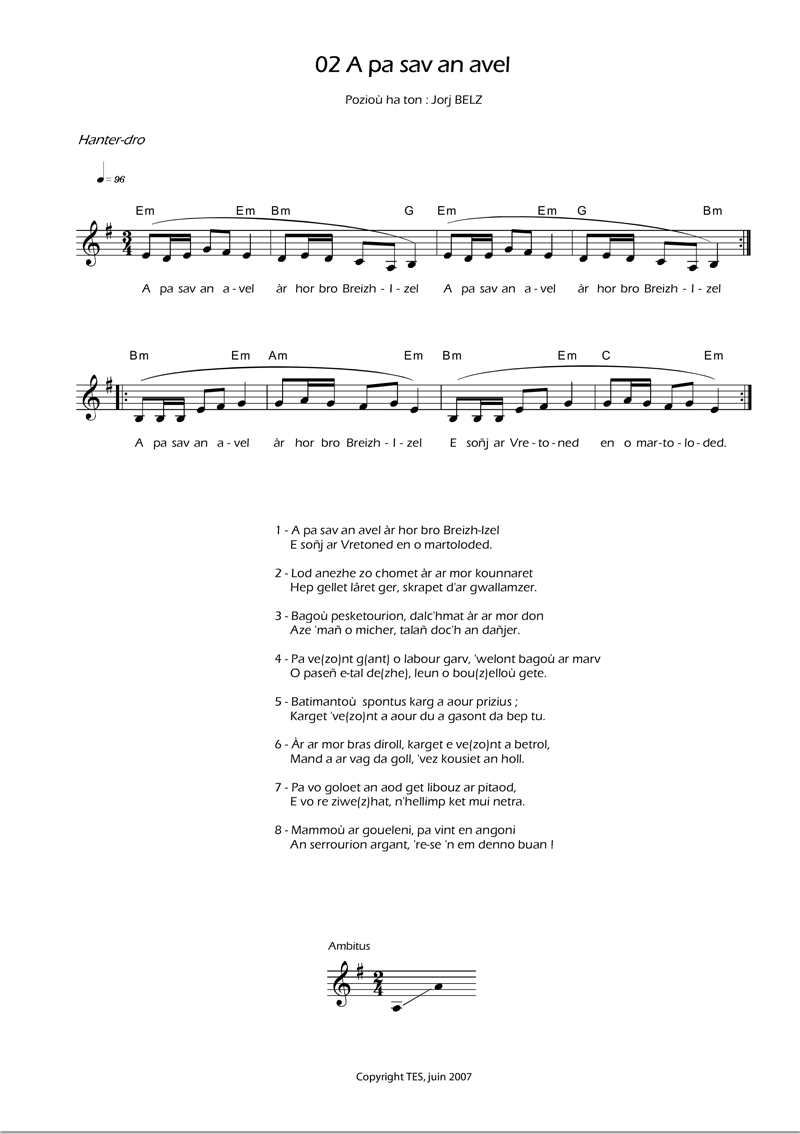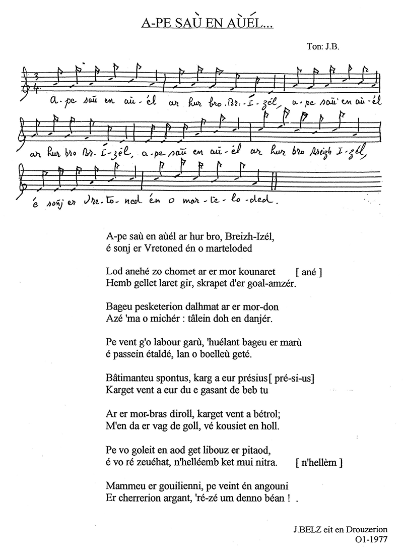 E 1978, da geñver peñse an Amoco Cadiz, e oa bet kompozet an destenn-mañ ; dre se e c'hellfe kaout blaz ar c'hozh met bez' emañ c'hoazh diouzh ar c'hiz, siwazh. E gwenedeg eo bet skrivet hag er rannyezh-se eo bravoc'h kanañ anezhi.