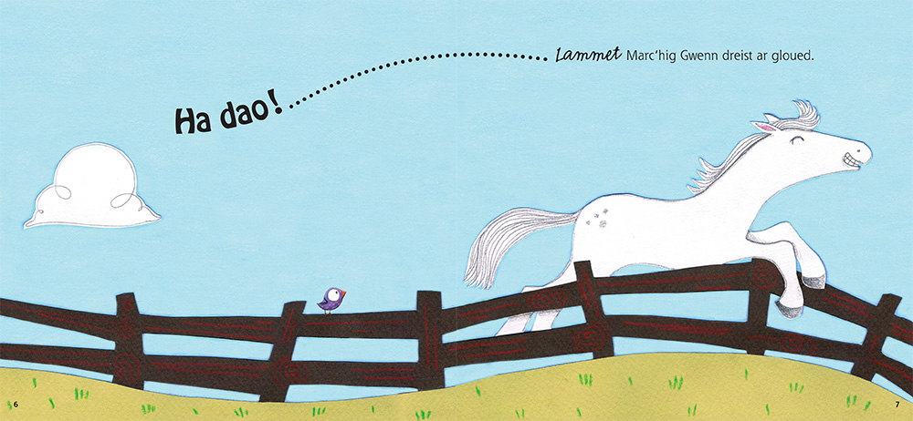 Un albom war astenn. Hey, hey, hey, Marc'hig gwenn a ya gant e hent.