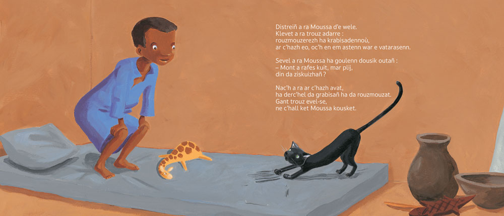 Kontadenn war astenn. Gant ar c'hoant kousket emañ Moussa. Met direnket eo gant ul logodenn oc'h ober trouz. Piv a c'hallo sikour anezhañ d'en em zizober diouti ? Ha dont a raio a-benn Moussa d'en em reiñ da gousket sioul ?