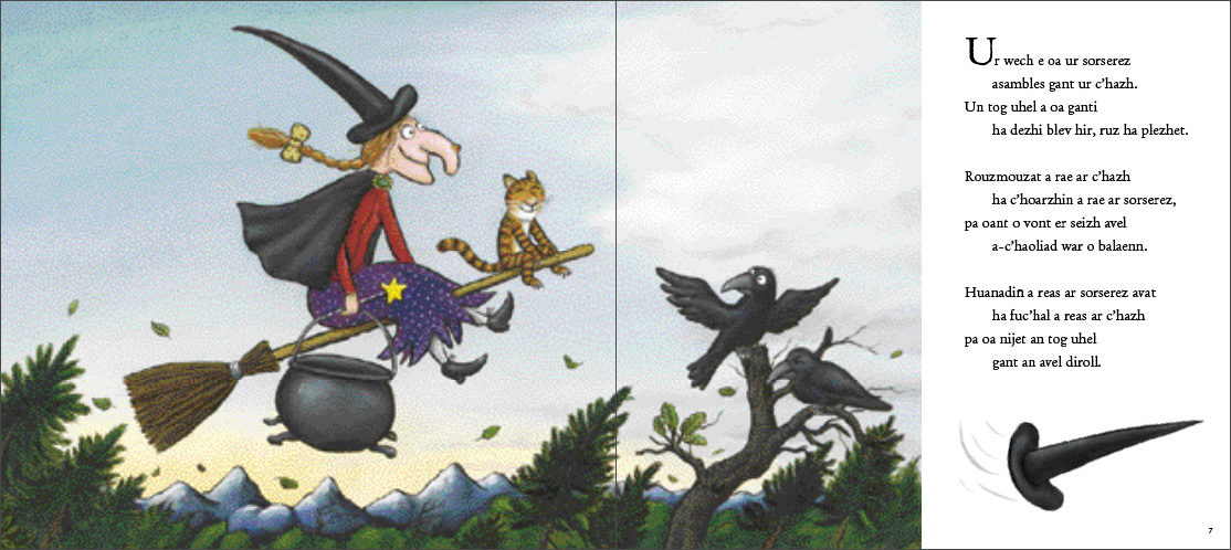 Ur wech e oa ur sorserez asambles gant ur c'hazh. Un tog uhel a oa ganti ha dezhi blev hir, ruz ha plezhet. Rouzmouzat a rae ar c'hazh ha c'hoarzhin a rae ar sorserez, pa oant o vont er seizh avel a-c'haoliad war o balaenn…