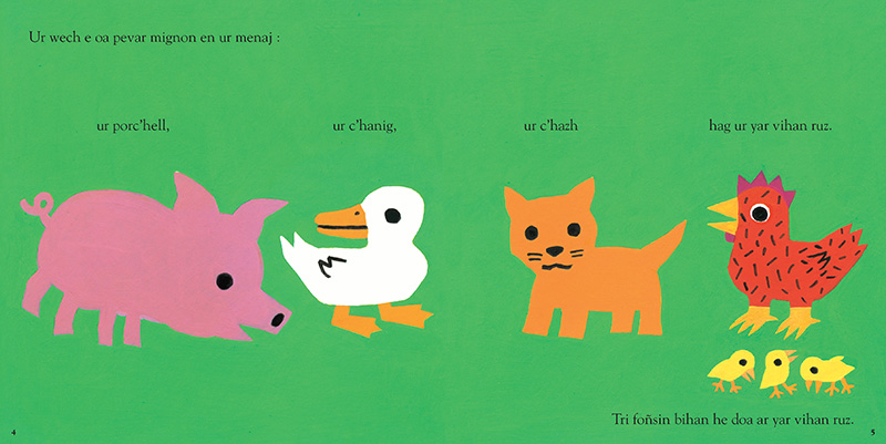 « Piv a sikouro ac'hanon da hadañ gwinizh ? » a lavaras ar yar vihan ruz. « Ne rin ket 'at ! » a lavaras ar porc'hell. « Na me kennebeut ! » a lavaras ar c'hanig. « Na me kennebeut all ! » a lavaras ar c'hazh. « Me a raio ma-unan neuze »...
